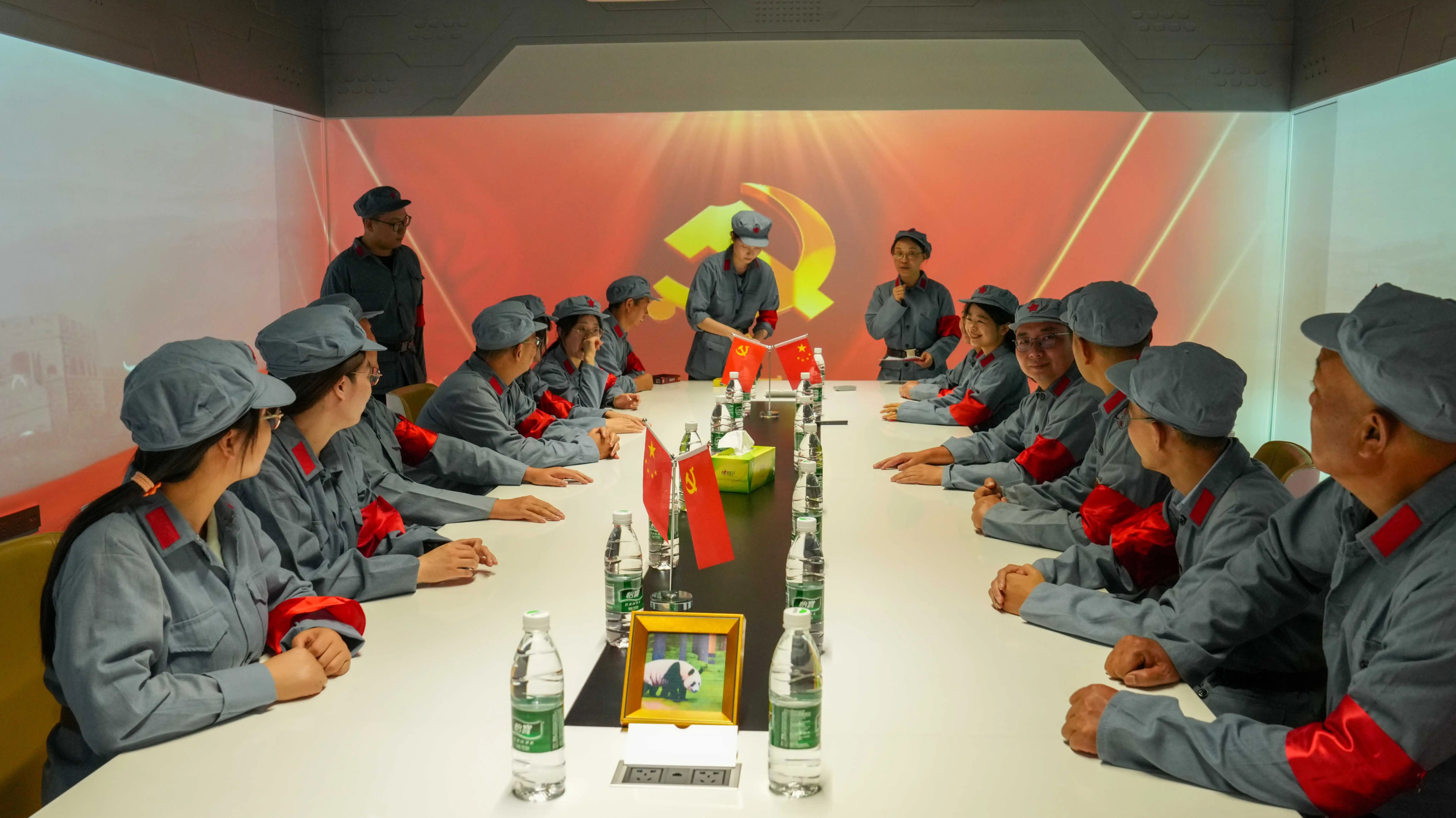 活動伊始,黨員們換上整齊的紅軍軍裝,仿佛穿越回那個烽火年代。在虛擬制作體驗區(qū)的LED環(huán)幕前,《長征前的秘密協(xié)議》徐徐上演,波瀾壯闊的畫面與震撼的音效將大家?guī)腴L征出發(fā)前的緊要關頭,信仰的力量在光影交織中鮮明躍動。