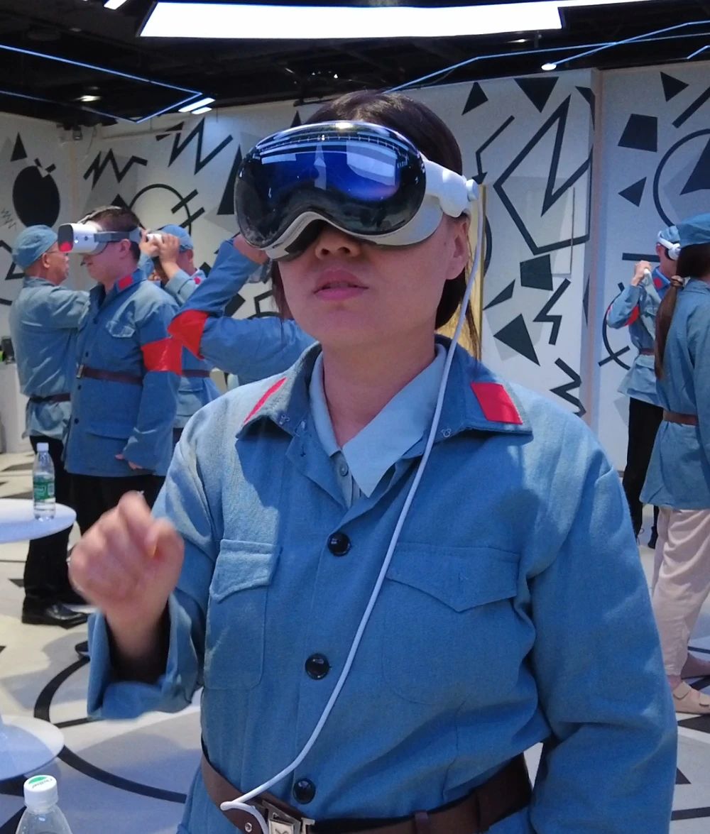 在“紅游智覽”環(huán)節(jié),黨員們佩戴VR紅色黨建一體機等頭顯設備,進入數(shù)智技術構建的沉浸式紅色空間。全景環(huán)繞的視聽效果,讓人仿佛置身歷史現(xiàn)場,步入那一幕幕定格于史冊的瞬間。隨著場景轉換,大家在虛擬與現(xiàn)實交織的氛圍中真切感受到信仰的厚度,并在互動協(xié)作中凝聚起奮進的力量。
